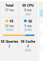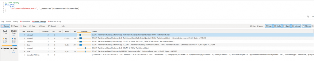 The first part of the server timings shows us that the query took 12 ms in the Formula engine (FE) and 5 ms in the storage engine (SE) a total of 12 ms to run. In addition, we can see that a total of 2 SE queries were parsed to the Vertipaq engine.
